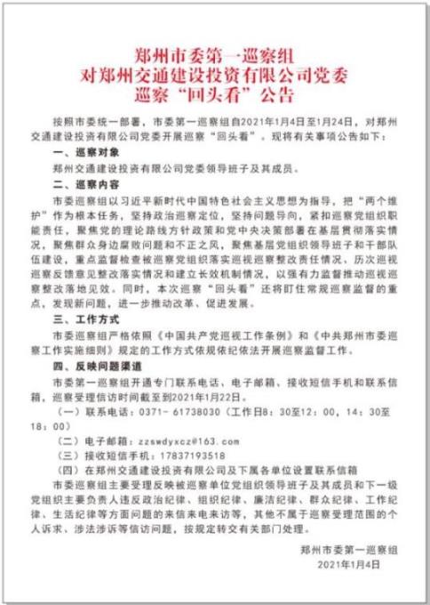 鄭州市委第一巡察組對(duì)鄭州交通建設(shè)投資有限公司黨委巡察“回頭看”公告