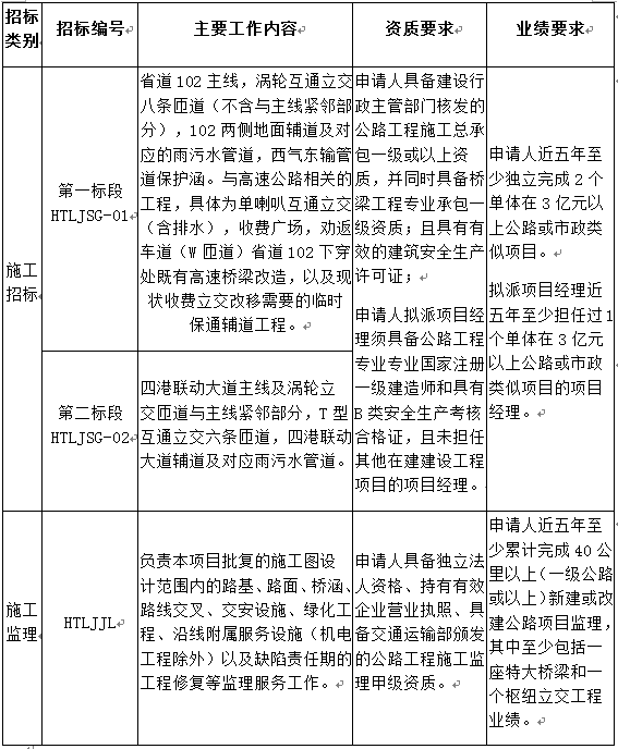 2.4招標編號、招標內(nèi)容、資質(zhì)要求、業(yè)績要求及標段劃分;施工劃分2個標段、施工監(jiān)理劃分1個標段。