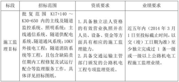 2.4標段劃分:本次施工監(jiān)理標劃分為1個標段,施工監(jiān)理Ⅱ標:批復范圍K17+140~K30+650內(nèi)的主線及隧道監(jiān)控系統(tǒng)、照明系統(tǒng);主線通信系統(tǒng)、隧道供配電系統(tǒng)、隧道通風系統(tǒng);10KV外接電工程;隧道消防系統(tǒng)等工程,且包含缺陷責任期內(nèi)工程修復及試運行配合等監(jiān)理服務工作。具體詳見招標圖紙。