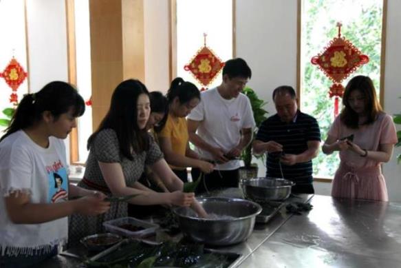 公司精心準(zhǔn)備了粽葉、糯米和大棗、花生米等粽子餡,大家圍在一起,紛紛露出看家本領(lǐng),捋粽葉、做漏斗狀、填糯米、壓緊實(shí)、封口、扎捆,巧手翻飛,不一會(huì)兒功夫,三角形、牛角形、長(zhǎng)條形等一只只各式各樣的漂亮粽子瞬間成型。在包粽子過程中,大家互相交流,互相學(xué)習(xí),不會(huì)包的員工拿著竹葉一步一步的跟著會(huì)包的員工學(xué)習(xí),雖然包的不太好,但是看著自己親手包好的粽子很是欣喜。